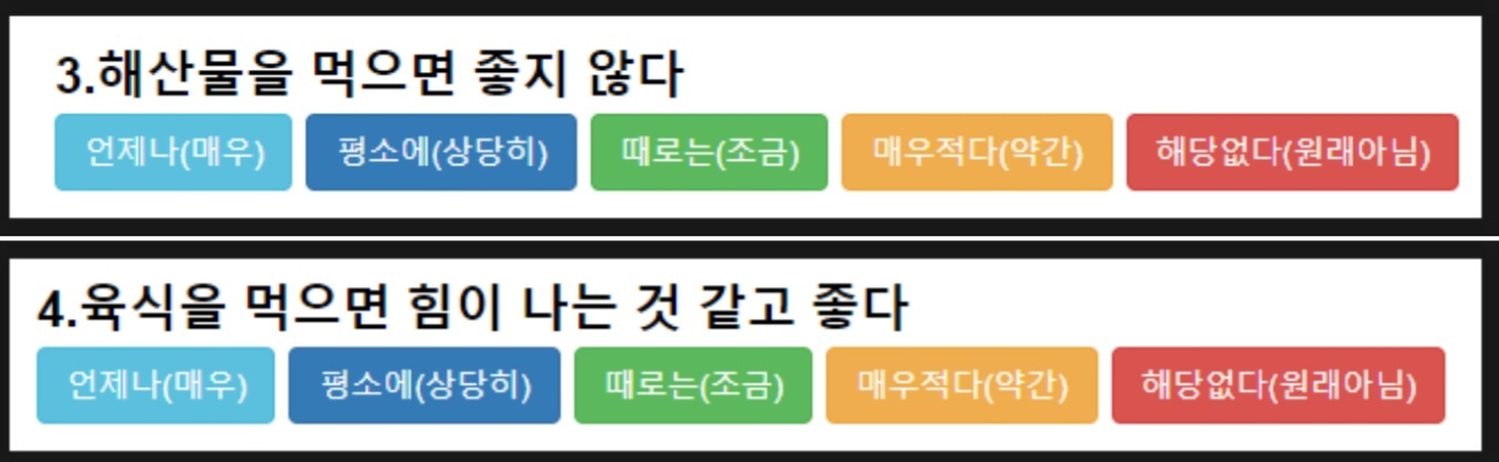 8체질 자가진단 결과는 자라온 환경, 부모님의 식생활에 따라 내용에 맞지 않더라도 적응이 되어 반응이
