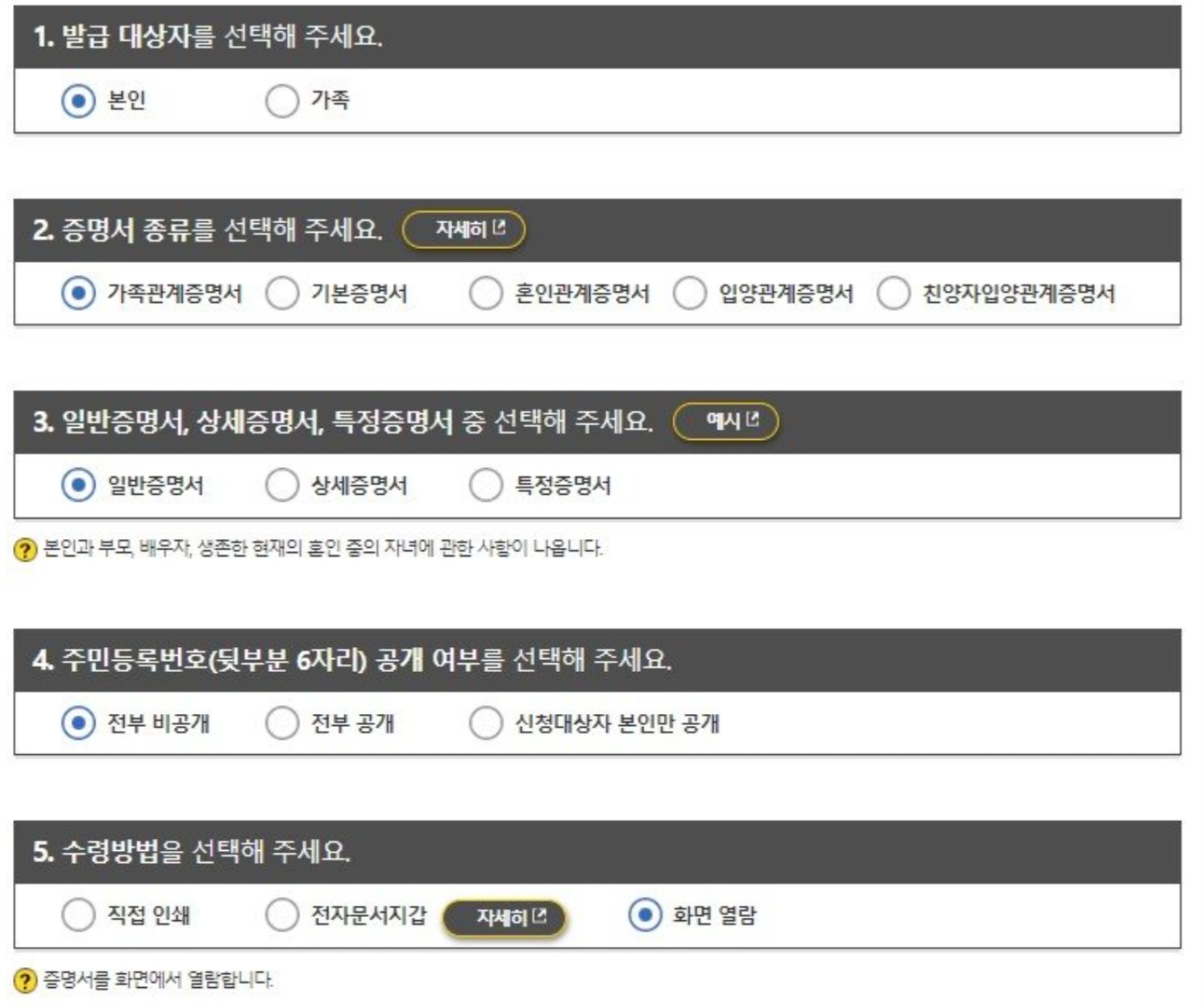 - 발급 대상 / 증명서 종류 / 주민번호 공개여부 / 수령방법 등을 선택하시면 돼요.
