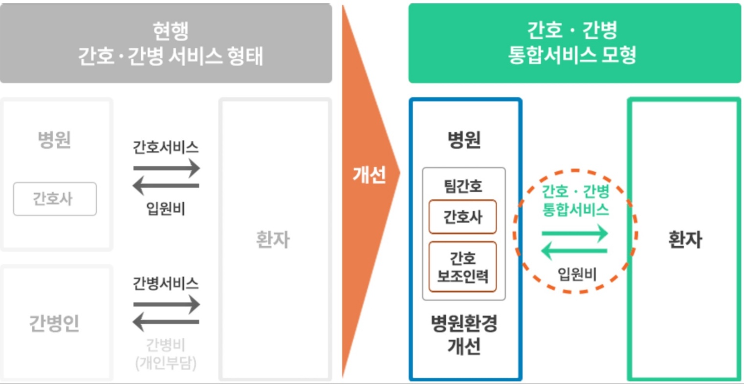 간호 간병통합서비스란 입원환자가 보호자나 개인고용간병인이 필요 없도록 간호인력에 의해 전문적인
