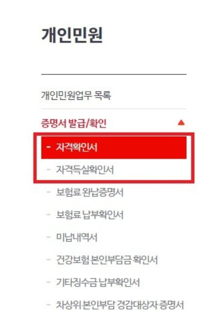 그리고 건강보험자격확인서 메뉴가 따로 있어요.