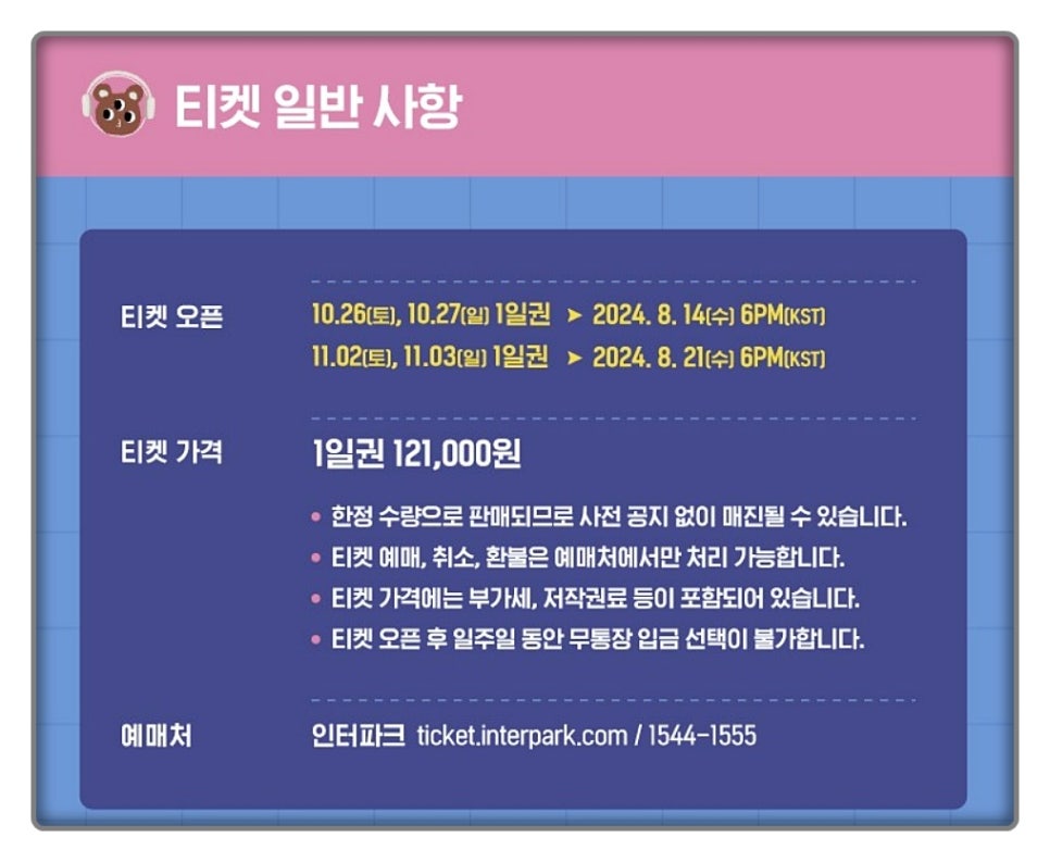티켓은 일자별로 판매되며, 예매는 인터파크와 YES24에서 가능합니다.