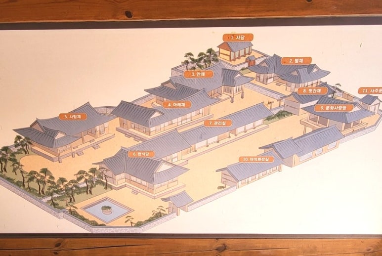 사랑채, 안채, 별채, 아래채, 바깥채 등 총 7동 13개의 객실로 이루어진 이 전통 한옥은 옛 건축양식의