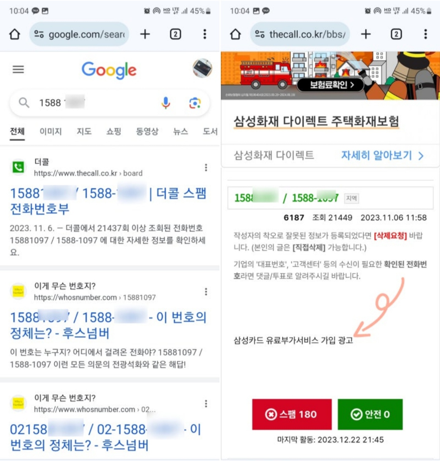 별도의 앱 설치 없이 확인할 수 있으나 이미 전화가 온 뒤에 검색으로 확인하는 방법이기 때문에 미리 확인은 안 되는 점