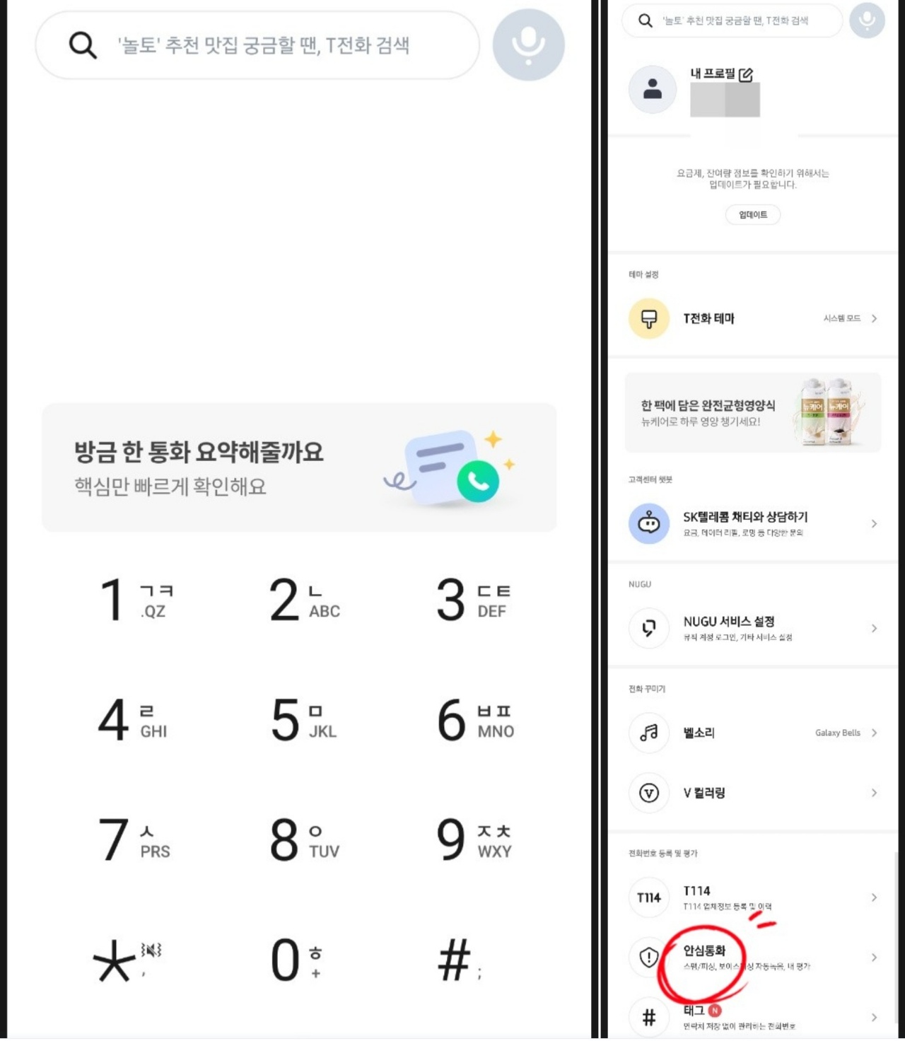 그런 다음 안심통화 메뉴를 선택하세요.