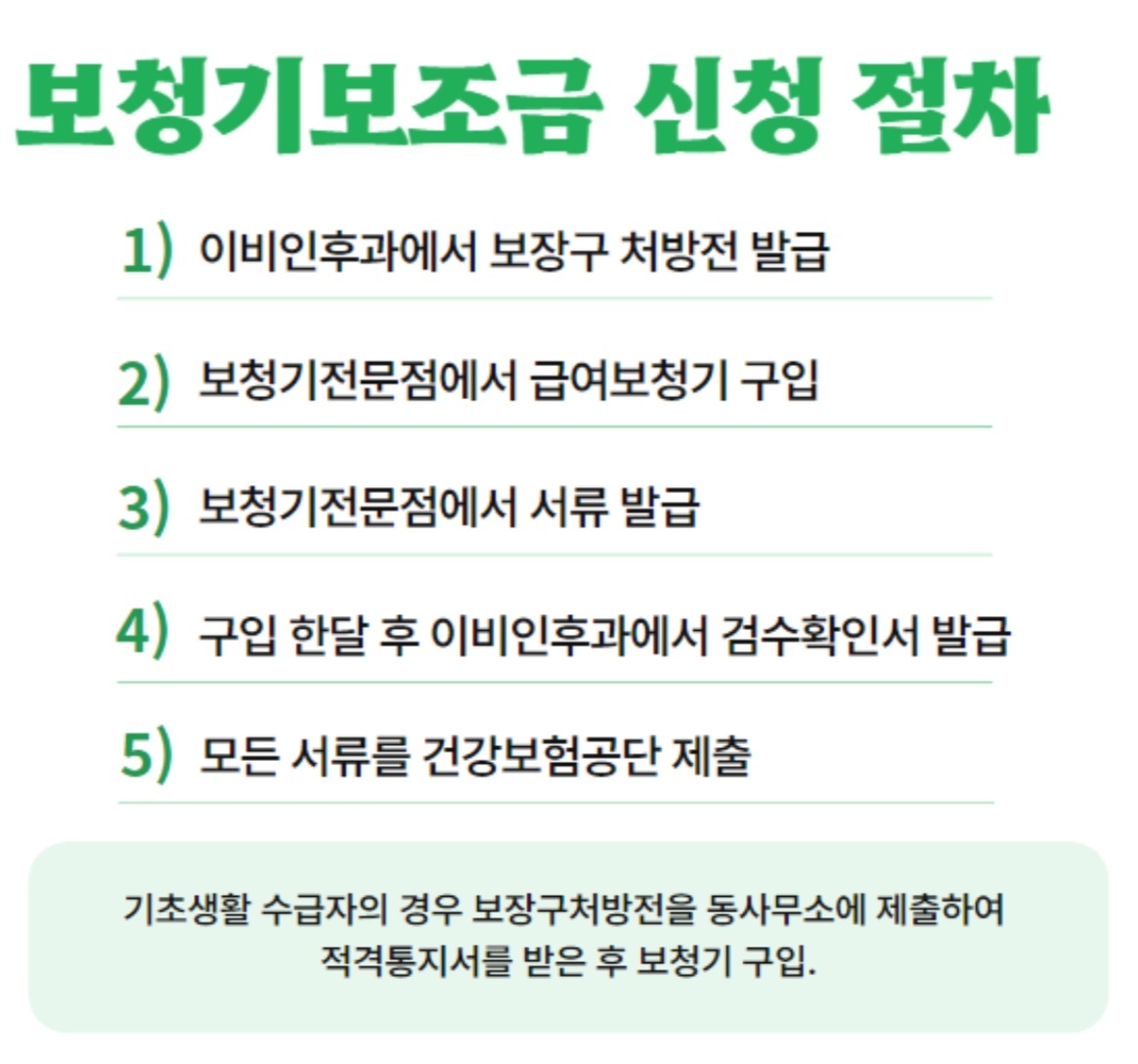 - 보장구 처방전을 가지고 보청기전문점에 방문하셔서 건강보험공단에서 지정한 급여보청기로 구입해주세요.