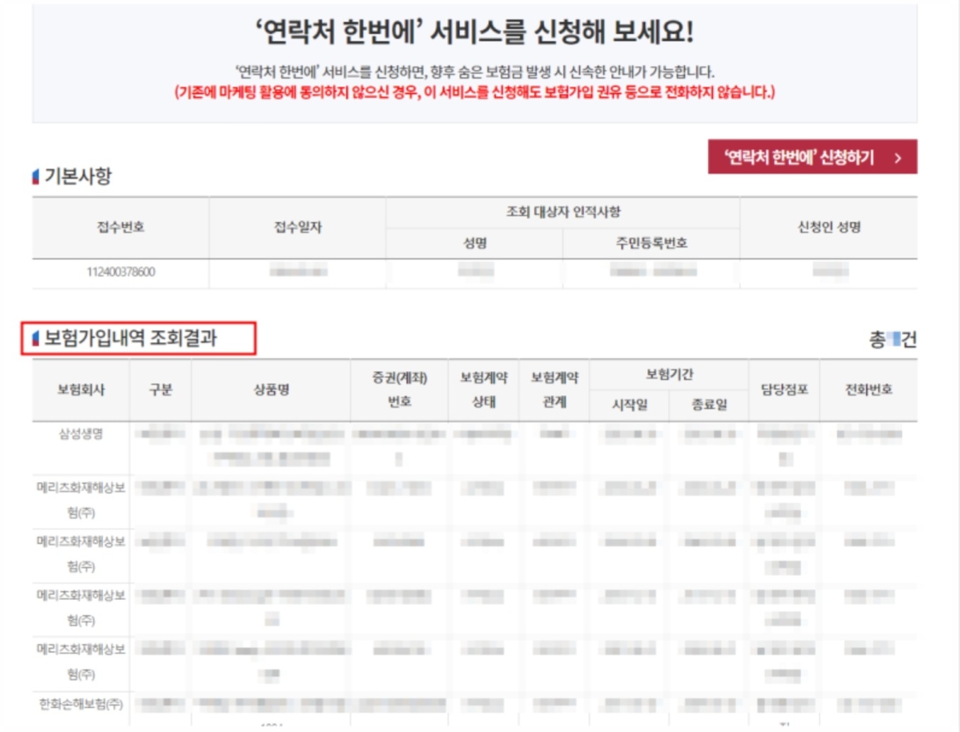 나의 인적사항이 간단하게 나오고 바로 가입내역 조회 결과가 보여요.