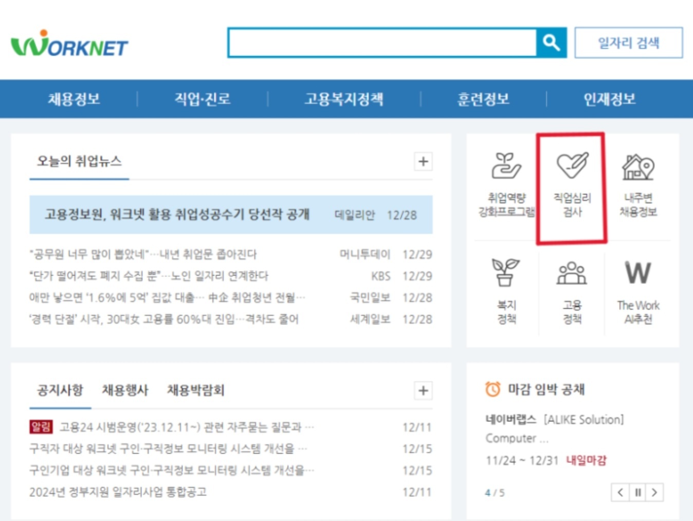 워크넷 로그인 후 메인화면 우측 상단에서 [직업심리검사]를 클릭해요.