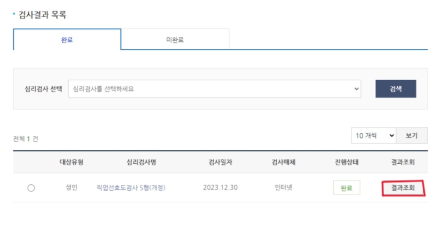 검사를 완료하셨으면 검사 결과 목록에 진행 상태가 '완료'인지 확인 후 [결과조회]를 눌러 결과지를 저장하세요.