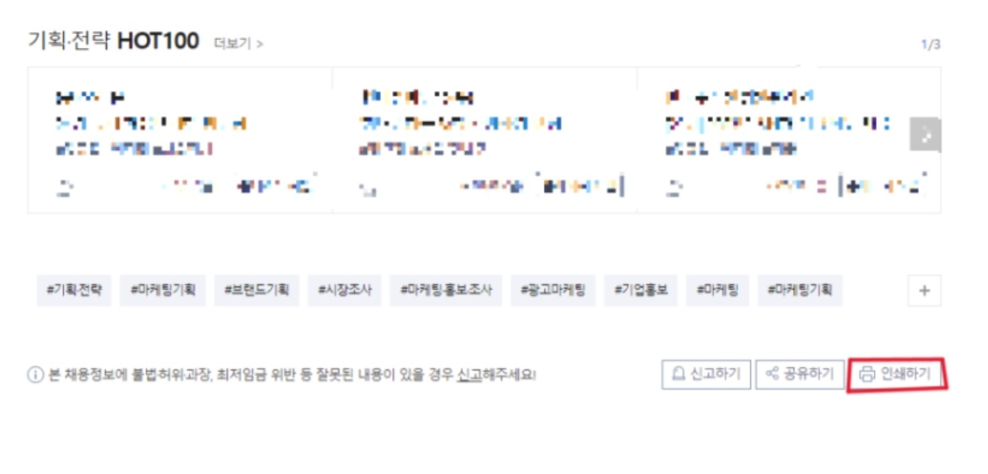 지원하신 채용공고에 들어가서 페이지 맨 하단까지 내려주시면 우측에 {인쇄하기} 버튼이 있으니 눌러서 PDF로 저장해