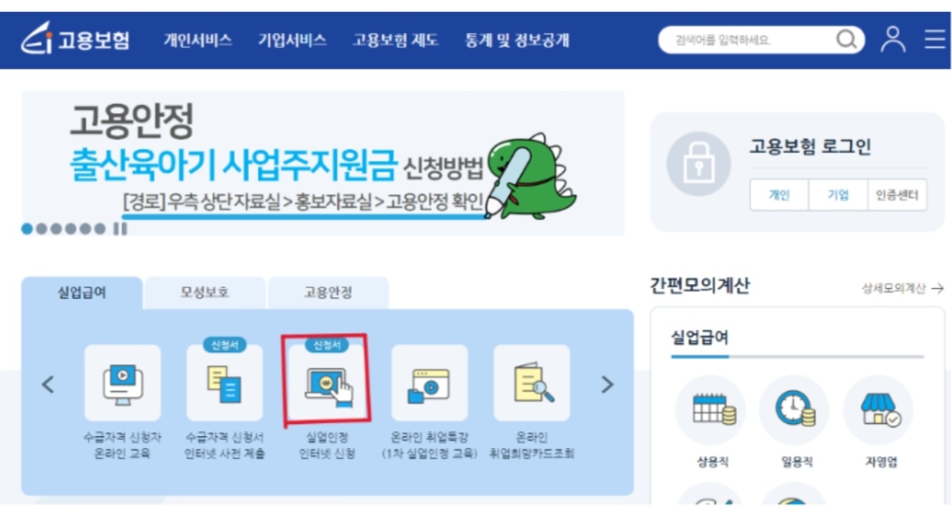구직활동 2회를 완료하셨다면 실업급여 5차 실업인정을 받기 위해 우선 고용보험 사이트에 접속해 주세요.