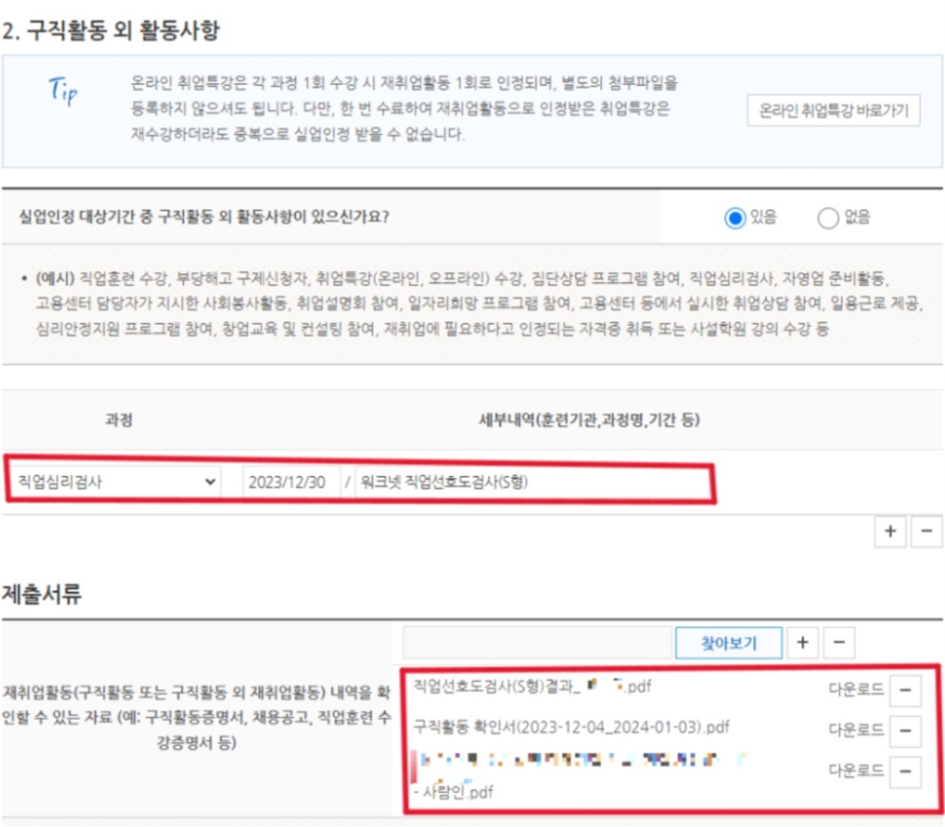 구직활동은 총 2회를 실시해야 하며, 특이하게 그 중 1회는 워크넷에서 제공하는 직업선호도 심리검사로