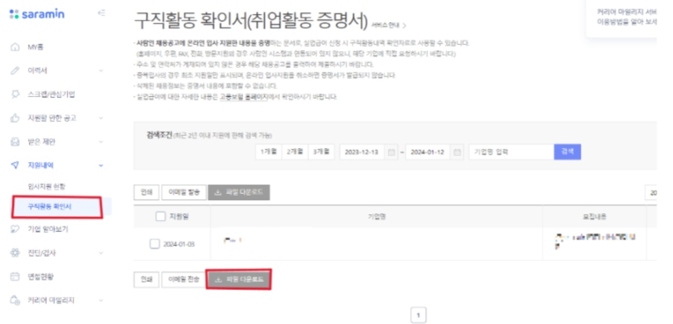 입사지원이 완료되면 지원내역 > 구직활동 확인서 페이지에 들어가셔서 하단의 [파일 다운로드]를 클릭해 구직활동