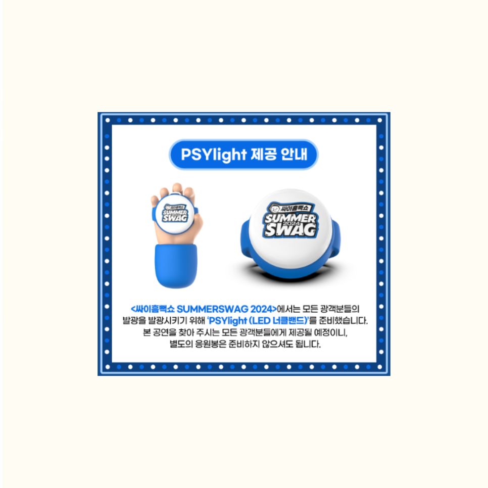 이번 2024 싸이 흠뻑쇼에서는 모든 관객분들에게 소품과 함께 공연을 즐길 수 있게 PSTlight