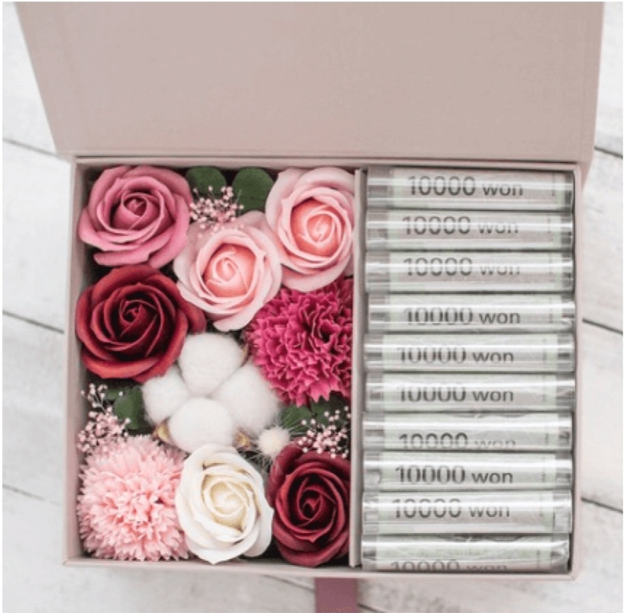 부모님들께서 가장 많이 선택해주신 비누 꽃 용돈 박스예요.