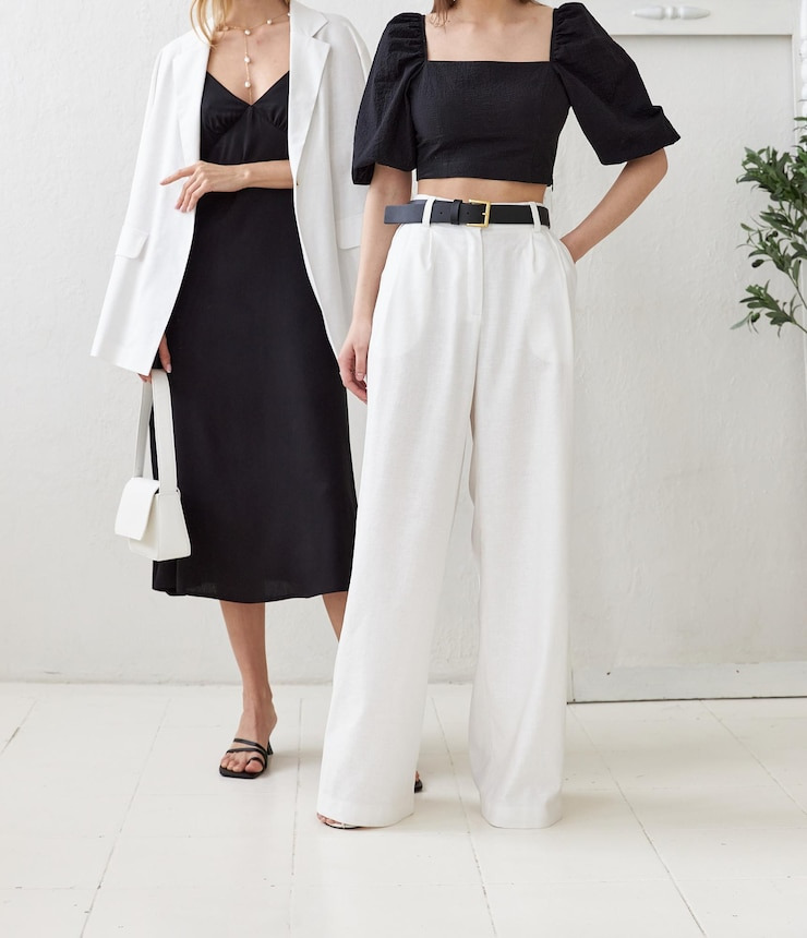 여기에 크롭 탑이나 타이트한 티셔츠를 매치하면 한층 세련된 여름 룩이 완성됩니다.