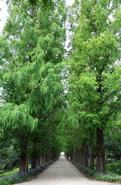 이곳에서 가장 돋보이는 풍경 중 하나는 하늘 높이 솟은 메타세쿼이아 나무 숲입니다.