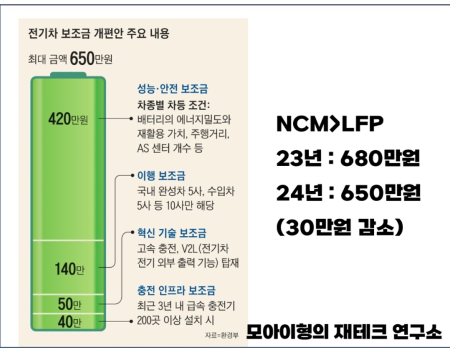 현재 LFP(리튬인산철) 배터리를 장착한 저가형 중국산 자동차가 유럽 시장을 휩쓸고 있습니다. 기아나 현대자동차의 경우 NCM(니켈, 코발트, 망간) 배터리를 탑재한 차량이 많은데 정부에서 LFP 배터리를 장착한 차량의 지원금을 줄이고 NCM 배터리를 장착한 차종에 대해 지원금을 늘렸습니다.