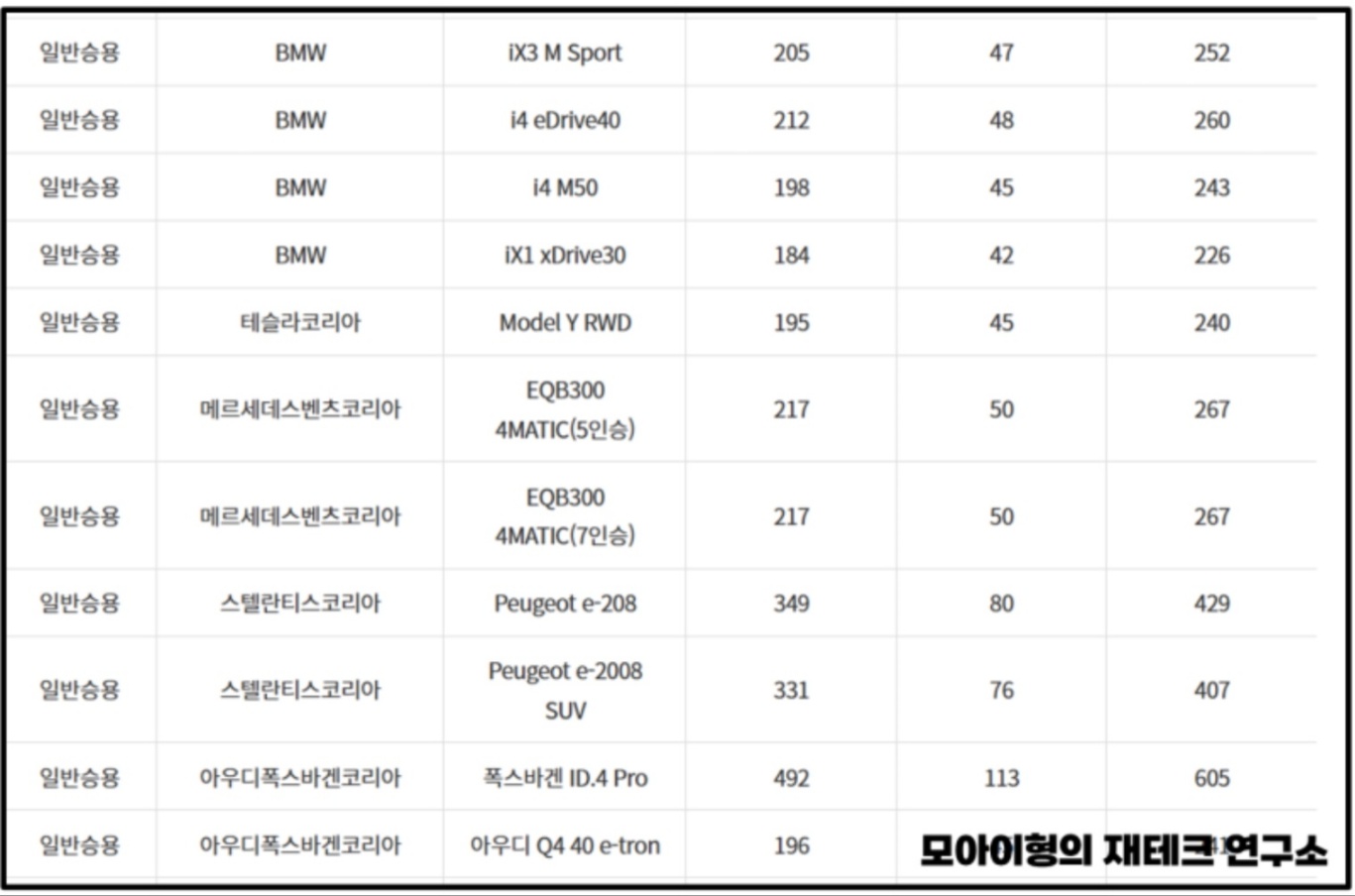 수입차를 보시면 전체적으로 보조금이 낮은 것을 확인할 수 있습니다. 테슬라의 모델 Y RWD는 240만원을 지원받습니다.