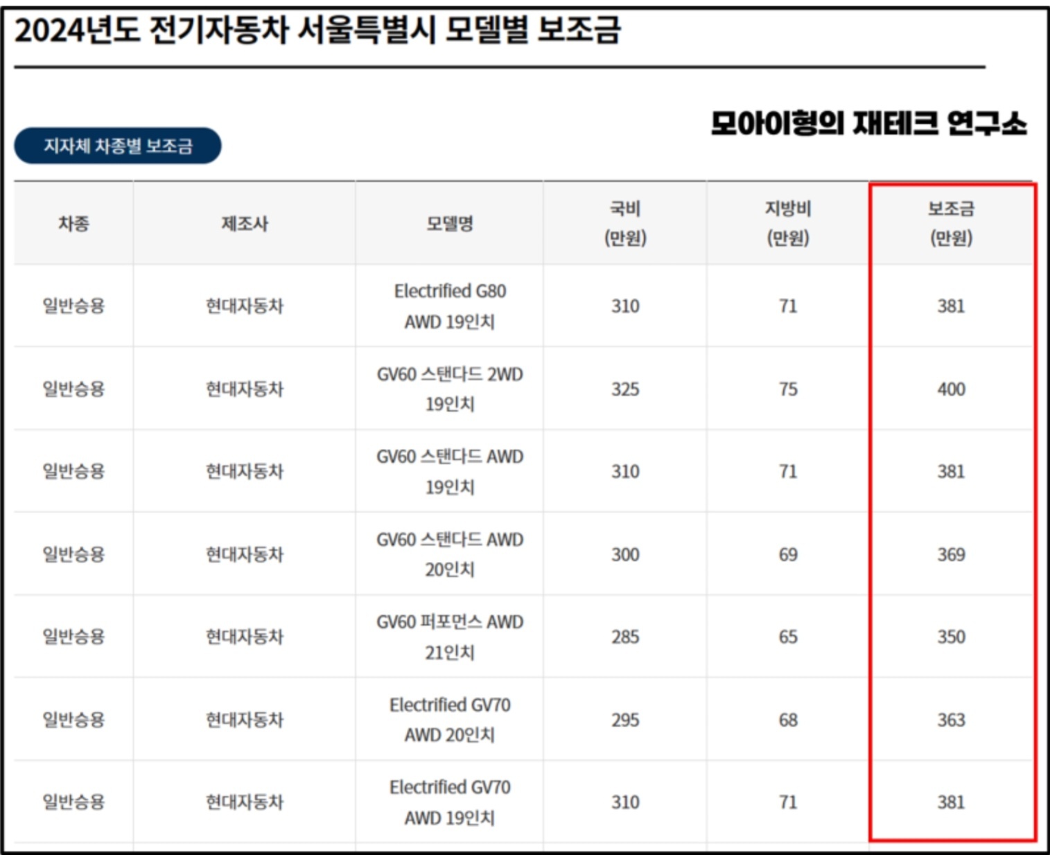 서울 특별시 조회를 하면 모델별로 국비와 지방비를 포함한 보조금이 나옵니다.
