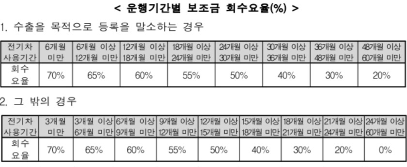 - 전기차 등록말소 신청이 접수되면 관할 지방자치단체 또는 한국환경공단은 해당 차량의 최초등록일 기준으로 법정 의무운행기간이 경과하였는지 확인하고 경과하지 않은 구매 보조금 지급액을 확인하여 등록말소를 신청한 자로부터 보조금을 회수해야 합니다(규제 「대기환경보전법」 제58조제4항, 「대기환경보전법 시행규칙」 제21조의 2, 제79조의 4제1항 및 「2023년 전기자동차 보급사업 보조금 업무처리지침」, 14쪽).