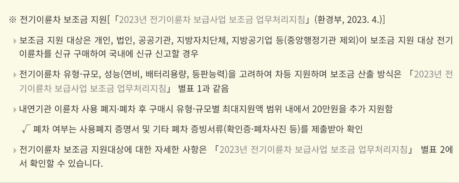 - 자동차 분류기준은 「자동차관리법 시행규칙」 별표 1에 따르며, 보조금 지원 대상 차종 지원금액은 「2023년 전기자동차 보급사업 보조금 업무처리지침」 별표5에서 확인할 수 있습니다(「2023년 전기자동차 보급사업 보조금 업무처리지침」 6-8쪽).