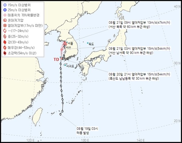 기상청은 열대저압부가 8월 21일 새벽까지 서해 남부 해상에서 북동쪽으로 이동할 예정이며,