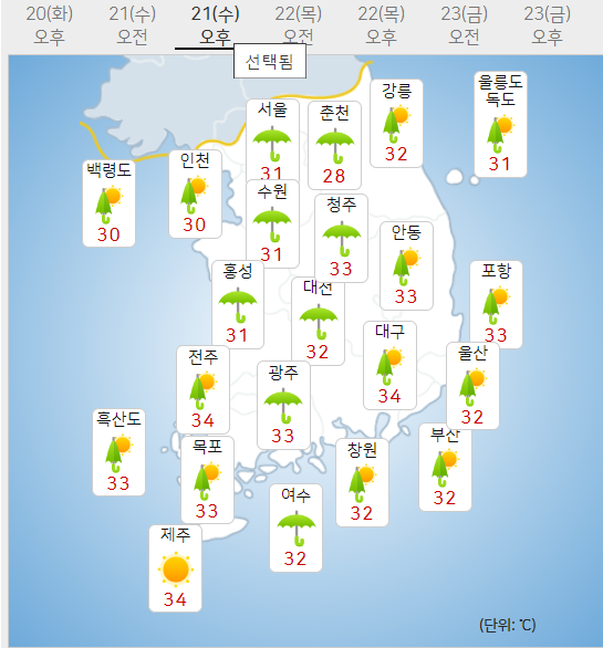 8월 21일 낮 최고 기온은 28 ~ 34도, 8월 22일에는 29 ~ 36도로 예보되었습니다.