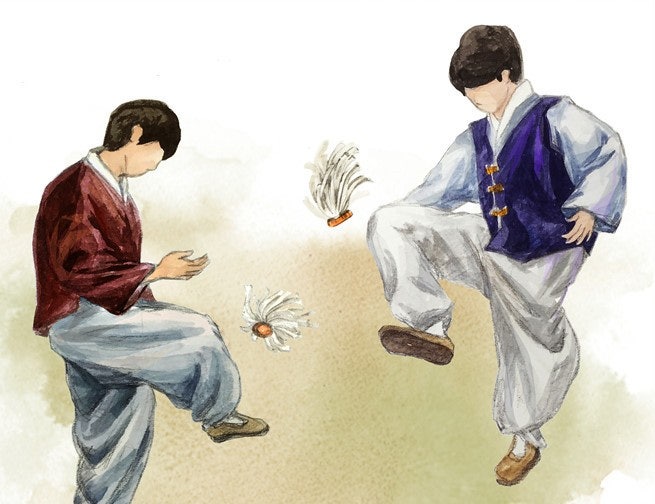전통 제기를 준비해도 좋지만, 없을 경우 종이와 비닐봉지를 돌돌 말아 간단히 제기를 만들 수 있습니다. 차례대로 제기를 차 올려 떨어뜨리지 않고 오래 유지하는 사람이 승리합니다.