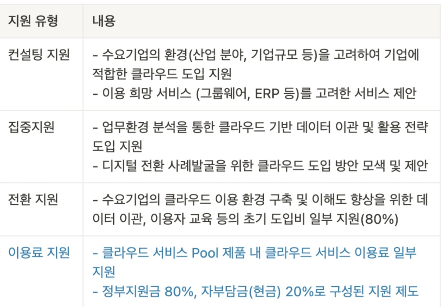 지원 내용 : 수요기업의 디지털전환을 위해 기업별 업무환경을 고려한 도입 컨설팅 및 클라우드 전환(데이터이관, 교육비), 서비스 이용료(바우처) 지원