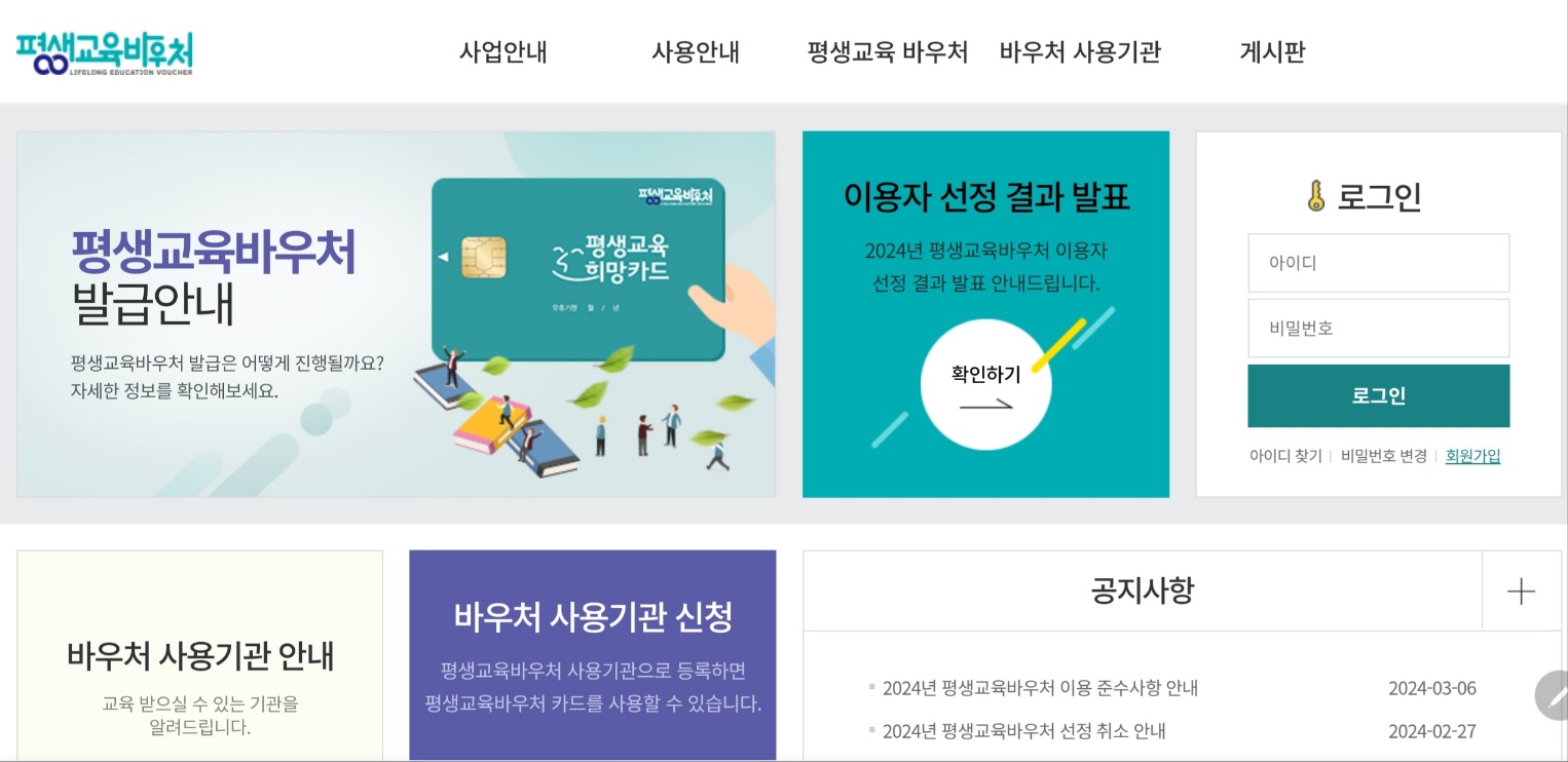 - 평생교육바우처 카드 사용 기간은 별도 공지 예정