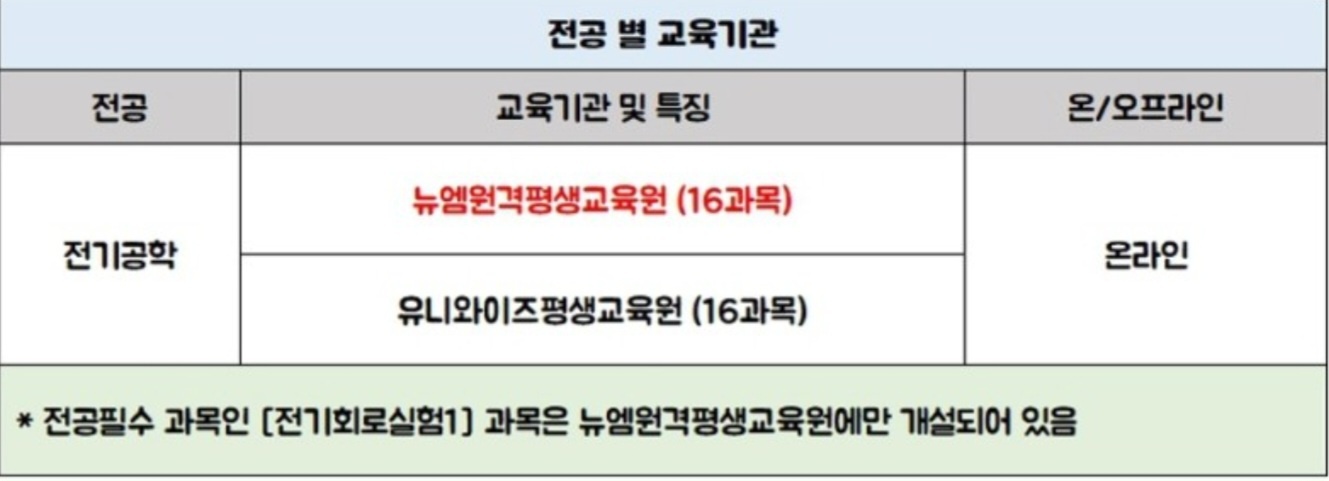 (15과목 이상 개설된 기관) 전기공학 과정의 특징으로는 전공필수 중 오프라인으로 진행되는 실험 과목이 있는 점을