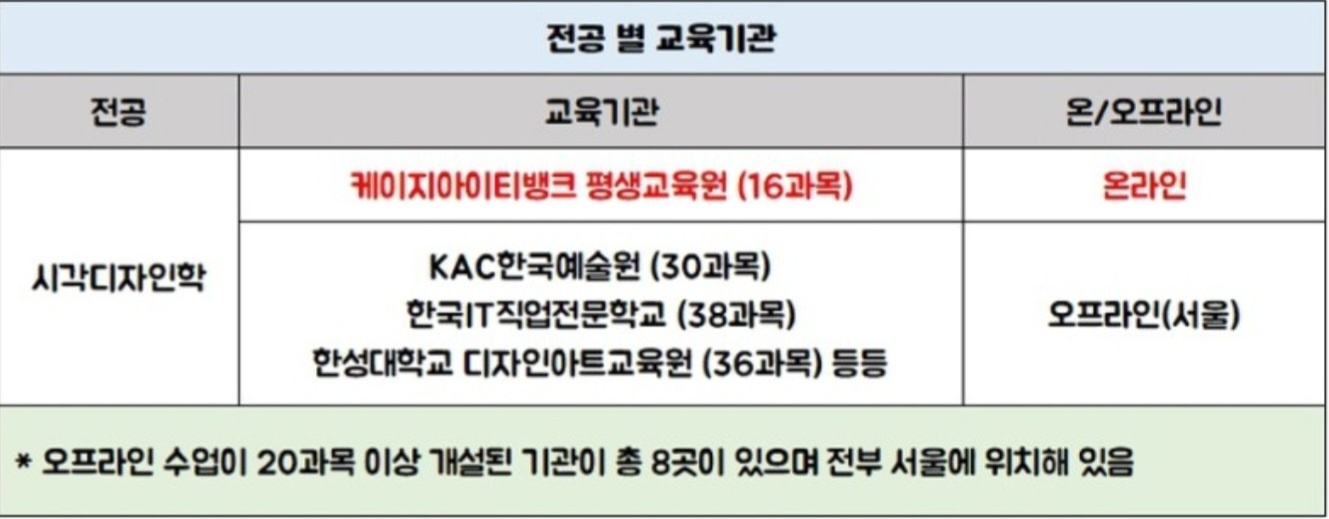 시각디자인 전공 수업이 온라인으로 개설된 학점은행제 교육기관도 딱 1곳이 바로 케이지아이티뱅크 평생교육원이예요.