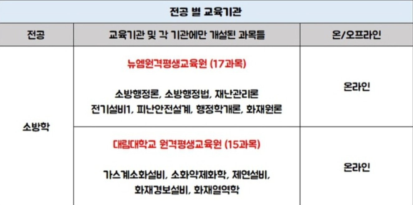 따라서 온라인으로 학위 과정을 진행하길 희망한다면 역시 (산업)기사 혹은 소방안정관리자 자격증 등을 취득하는