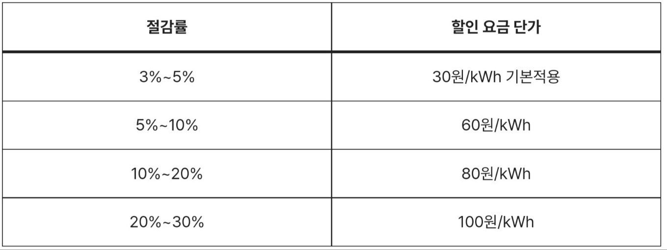 절감률이 5%이상일 경우 절감률에 따라 1kWh당 최대 100원까지 차등 할인 받을 수 있어요.