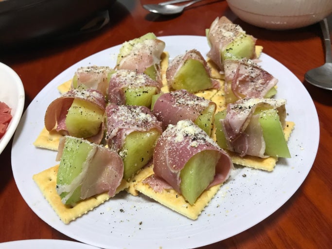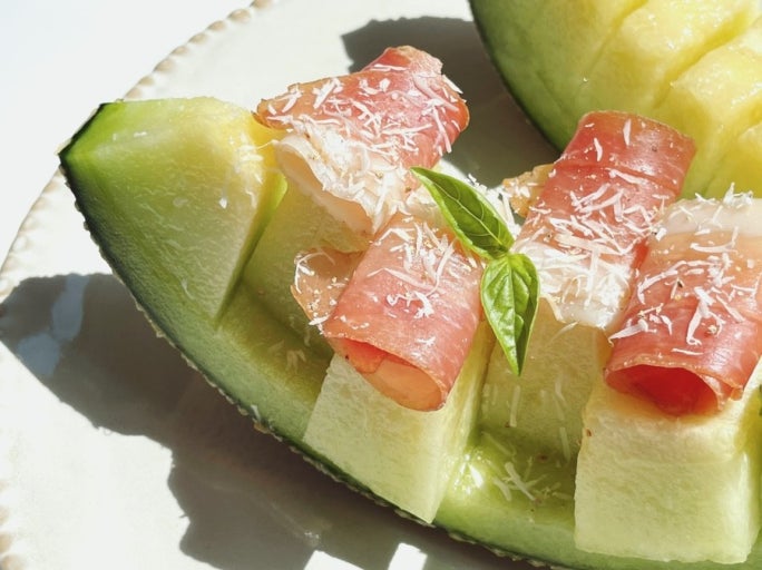 한입 크기로 자른 멜론 위에 얇은 프로슈토(이탈리아 생햄)를