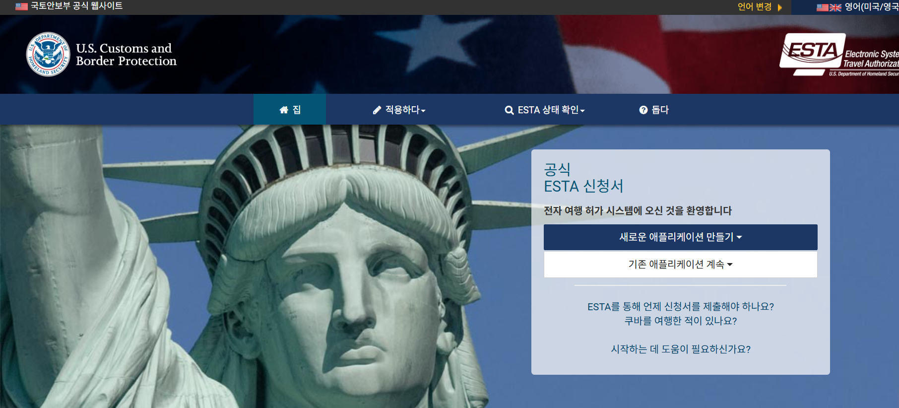 미국 국토안보부(DHS) ESTA 공식 홈페이지에 접속합니다.