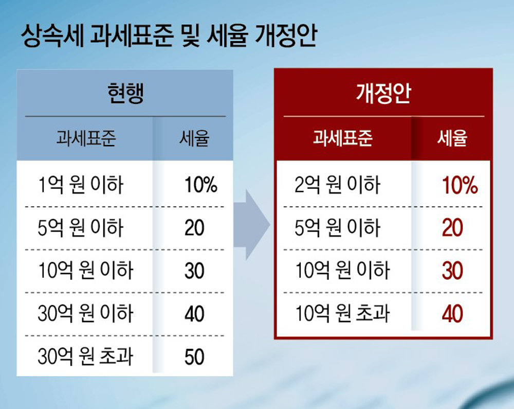 현재 상속세는 ▲1억원 이하 10%, ▲1억5억원 20%, ▲5억10억원 30%, ▲10억30억원 40%,